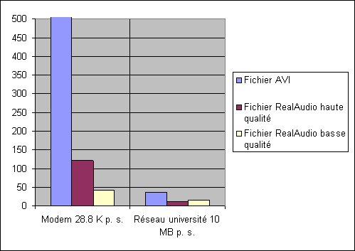 On peut constater que la compression ne sert pas à grand chose sur les réseaux à haut débit. Il y a un rapport de 1 à 3 entre le temps de transfert du fichier RealAudio haute qualité et le fichier AVI. Entre les deux types de fichier RealAudio, la différence n'est pas sensible.